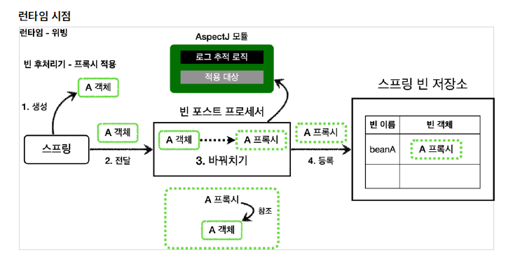 3. 런타임 시점 Spring에서 이 방법을 쓰며 , AspectJ의 문법,애노테이션,인터페이스를 차용해서 사용한다.