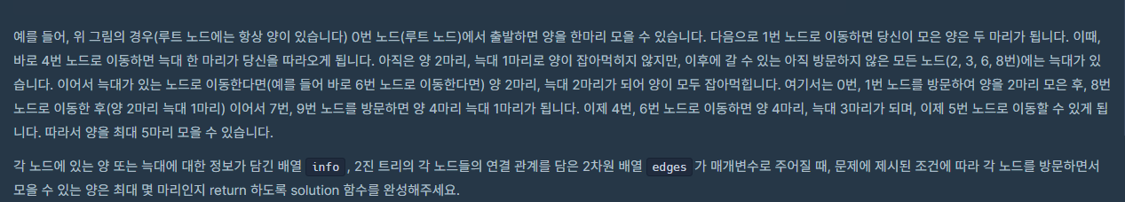 2. DFS탐색. 탐색할때마다 현재 양의개수로 새롭게 MAX를 갱신. 종료조건은 늑대가 양보다 더 많거나 같을 경우