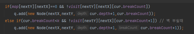 else if(cur.breakCount<k && !visit[nextY][nextX][cur.breakCount+1]) // 벽 부쉴때