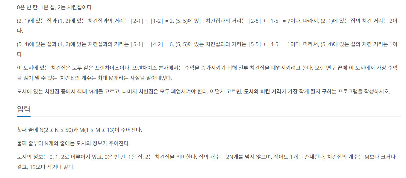 치킨 집 - 가정 집 사이의 거리를 최소로 하는 치킨 집들을 구해서 거리 합을 구하는 문제이다.