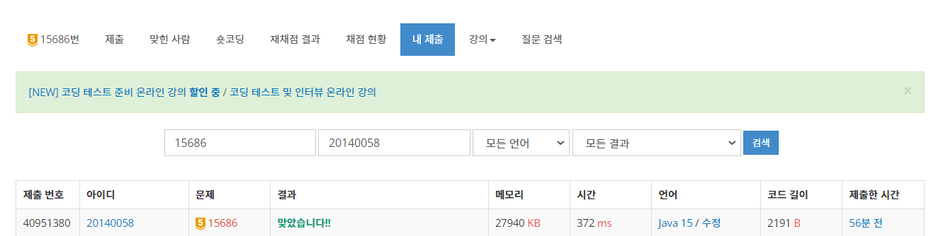 | [BOJ] 백준 [14442] 벽 부수고 이동하기 2JAVA (0) | 2022.03.09 |