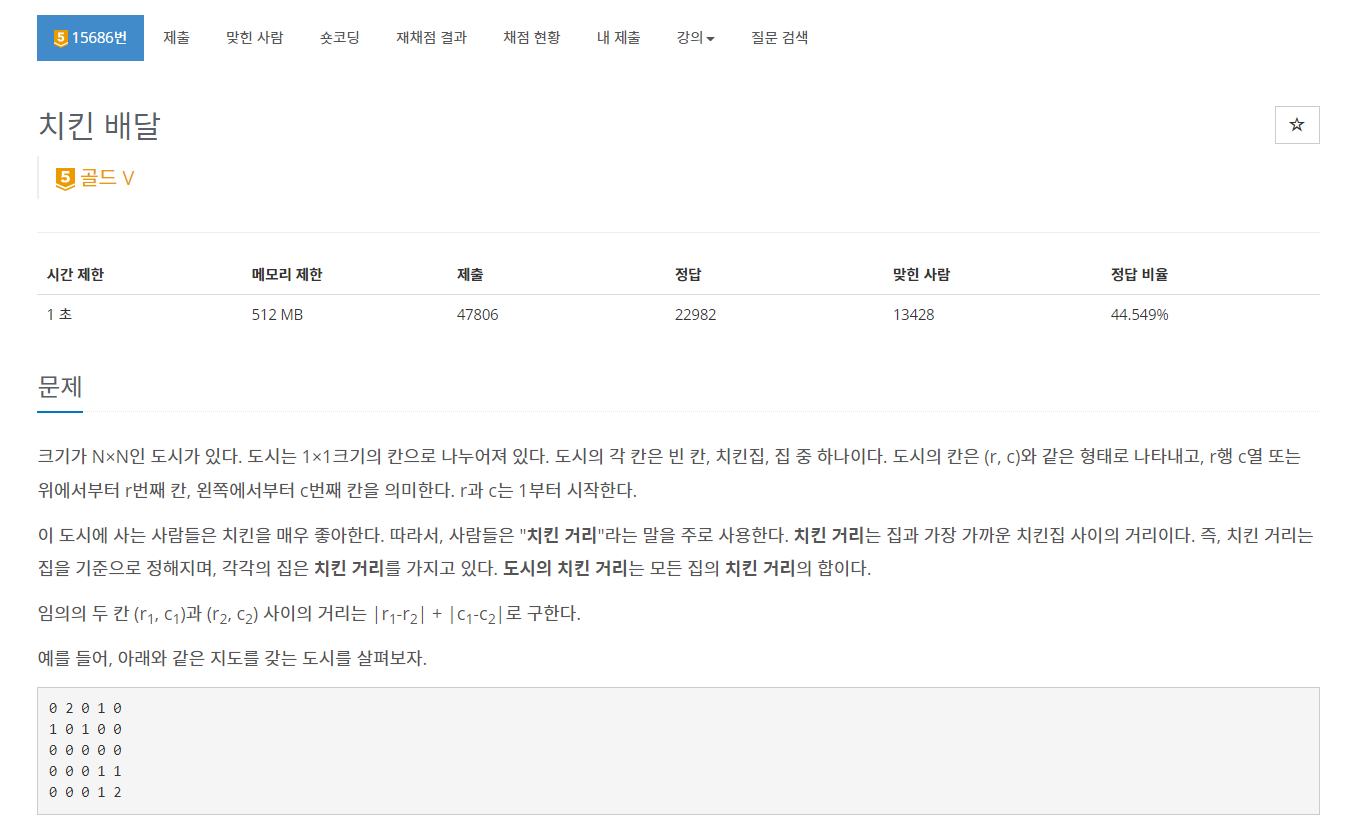 크기가 N×N인 도시가 있다. 도시는 1×1크기의 칸으로 나누어져 있다. 도시의 각 칸은 빈 칸, 치킨집, 집 중 하나이다. 도시의 칸은 (r, c)와 같은 형태로 나타내고, r행 c열 또는 위에서부터 r번째 칸