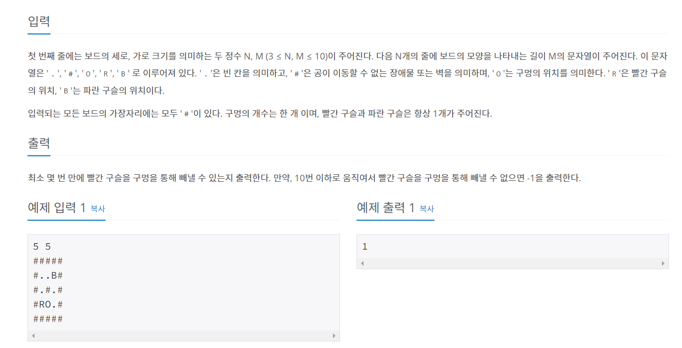 구슬을 이동시키다가 빨간색 구슬만 구멍에 빠지는 최소 move 카운트를 return 하는 문제이다