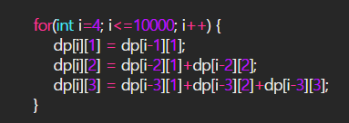 dp = new int[10001]; dp[1] = 1; dp[2] = 2 ; dp[3] = 3;