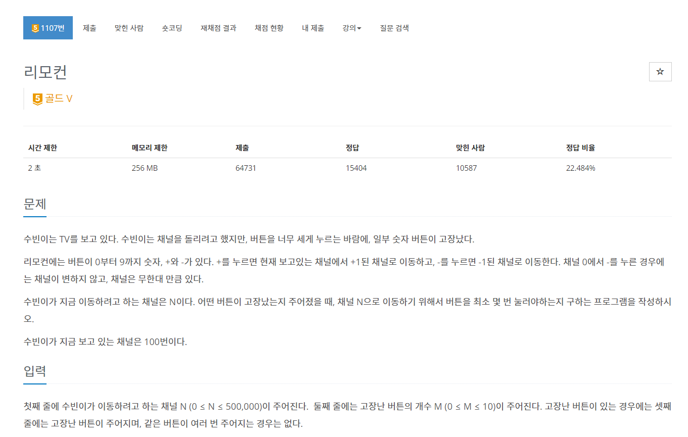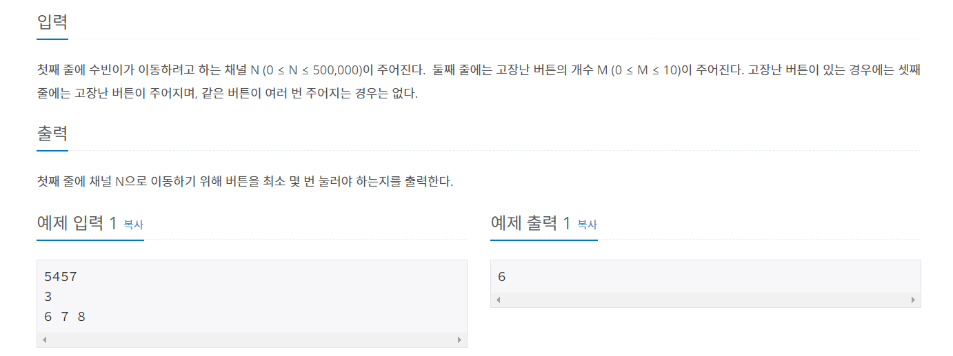 첫째 줄에 수빈이가 이동하려고 하는 채널 N (0 ≤ N ≤ 500,000)이 주어진다. 둘째 줄에는 고장난 버튼의 개수 M (0 ≤ M ≤ 10)이 주어진다. 고장난 버튼이 있는 경우에는 셋째 줄에는 고장난 버튼