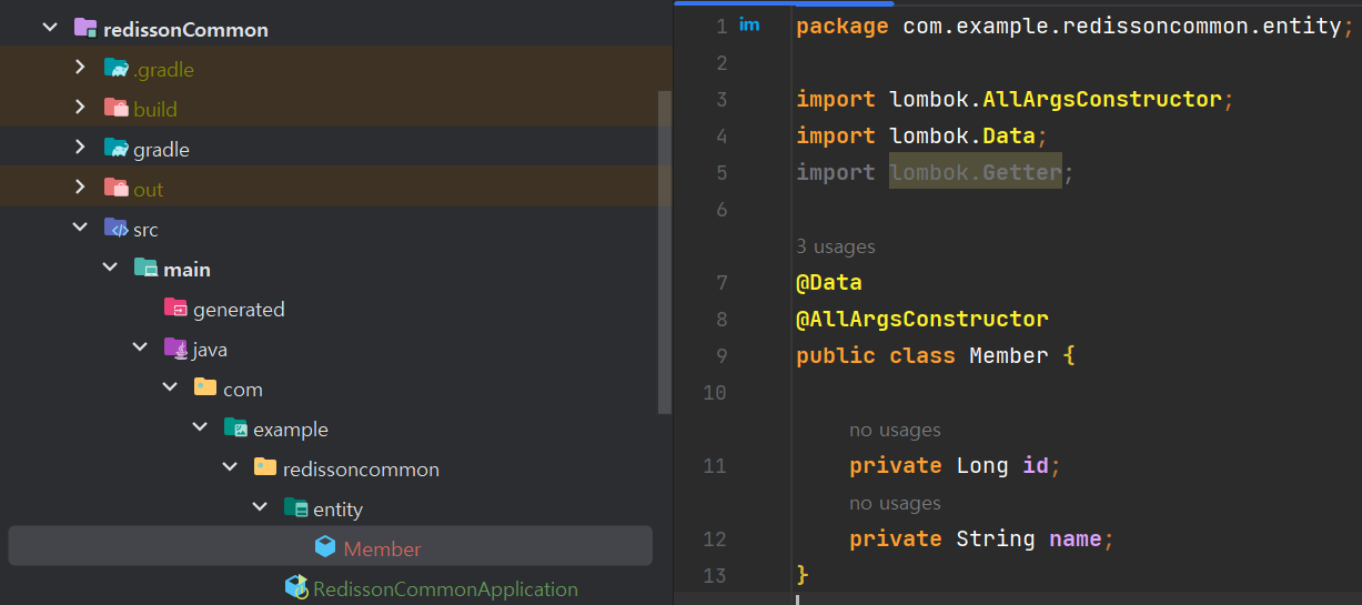 redissonCommon 프로젝트에 간단하게 ApplicationReadyEvent로 Member Entity 하나를 만들어서 redissonServer 모듈 실행 시 정상적으로 불러와지는지 확인해본다.