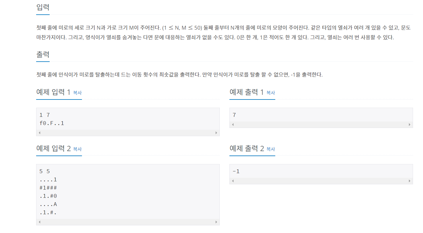 첫째 줄에 미로의 세로 크기 N과 가로 크기 M이 주어진다. (1 ≤ N, M ≤ 50) 둘째 줄부터 N개의 줄에 미로의 모양이 주어진다. 같은 타입의 열쇠가 여러 개 있을 수 있고, 문도 마찬가지이다. 그리고,