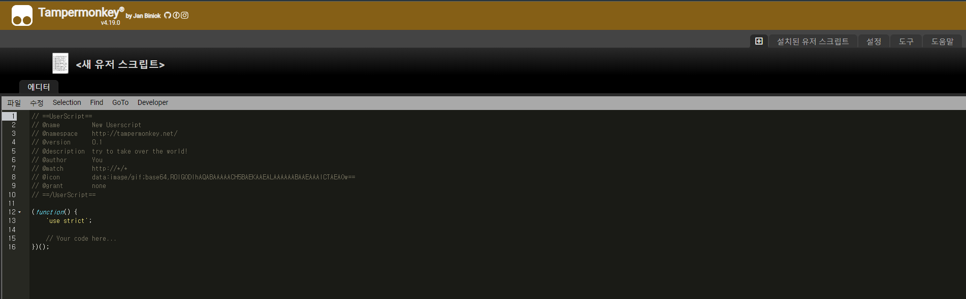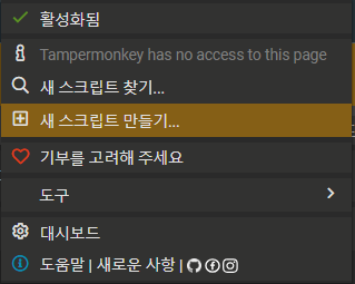그런 다음 원하는 스크립트를 작성하거나 Tampermonkey 스크립트 저장소에서 다른 사용자가 작성한 스크립트를 가져와 사용이 가능.