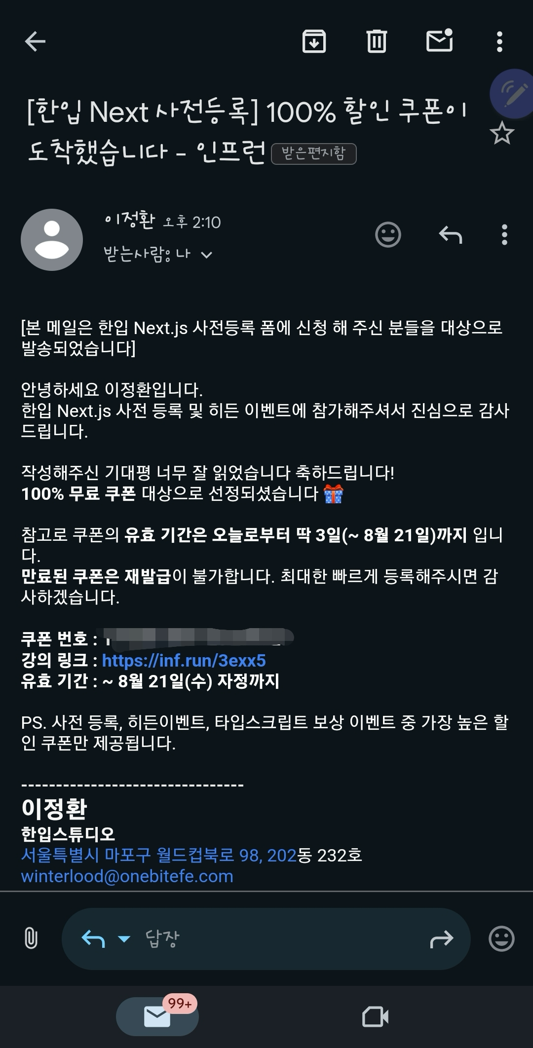 사전등록 이벤트 - 한 입 크기로 잘라먹는 Next.js(15+) - 신청자 전원 50% 할인 쿠폰 증정🎉 “한 입 크기로 잘라먹는 Nextjs” 사전 등록 이벤트