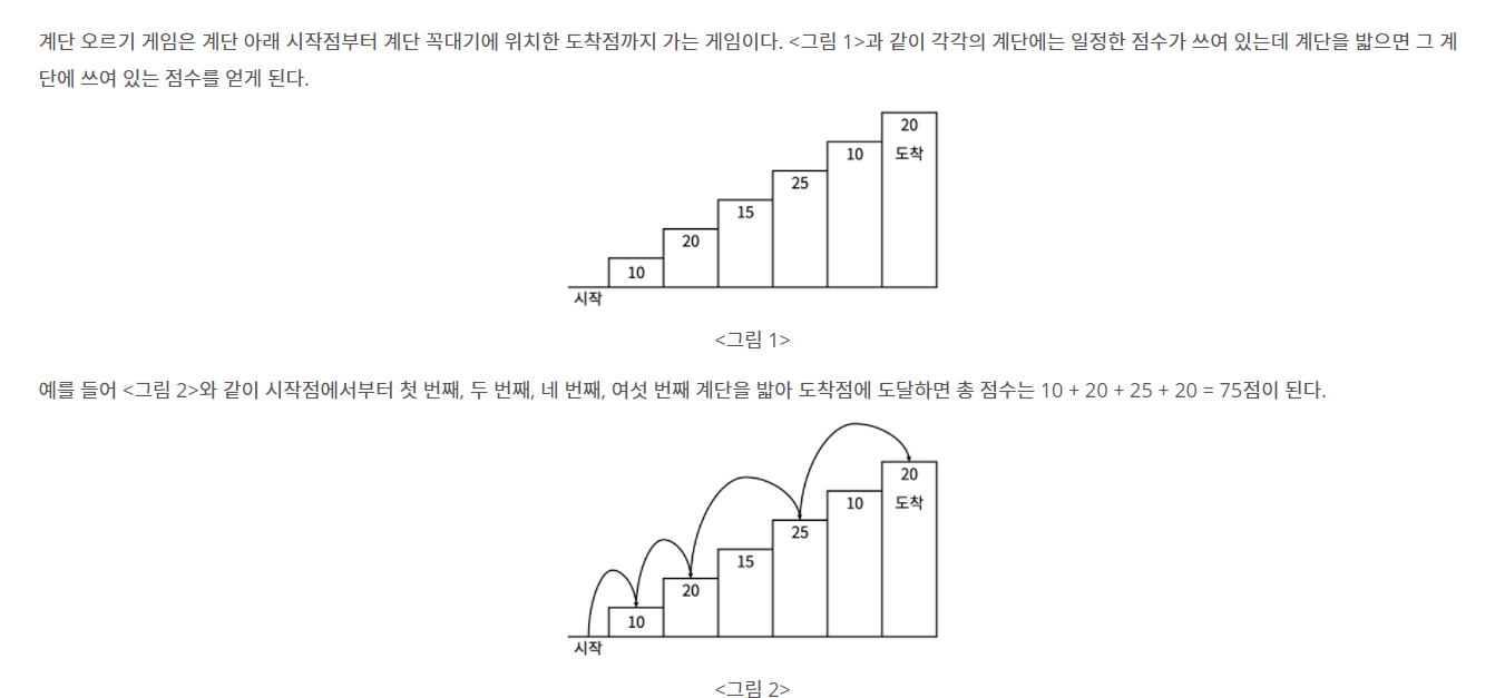 계단 오르기 게임은 계단 아래 시작점부터 계단 꼭대기에 위치한 도착점까지 가는 게임이다. <그림 1>과 같이 각각의 계단에는 일정한 점수가 쓰여 있는데 계단을 밟으면 그 계단에 쓰여 있는 점