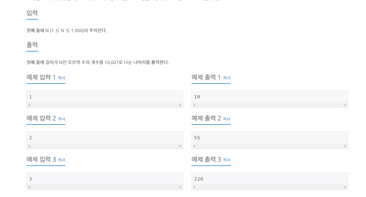 오르막 수는 수의 자리가 오름차순을 이루는 수를 말한다. 이때, 인접한 수가 같아도 오름차순으로 친다. 예를 들어, 2234와 3678, 11119는 오르막 수이지만, 2232, 3676, 91111은 오르막 수가 아니다. 수