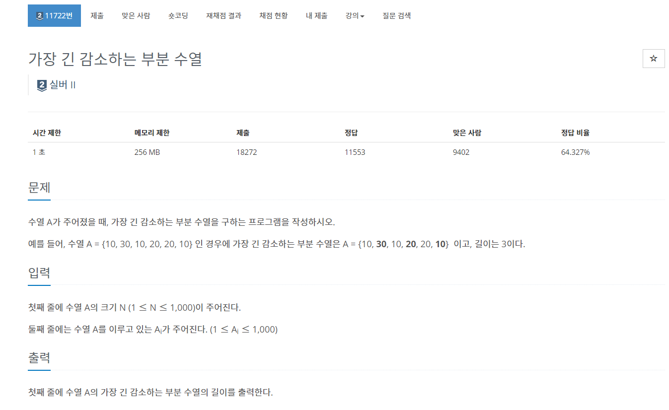 수열 A가 주어졌을 때, 가장 긴 감소하는 부분 수열을 구하는 프로그램을 작성하시오. 예를 들어, 수열 A = {10, 30, 10, 20, 20, 10} 인 경우에 가장 긴 감소하는 부분 수열은 A = {10, 30, 10, 20, 20, 10}