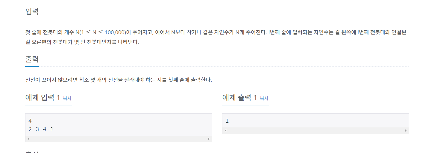 첫 줄에 전봇대의 개수 N(1 ≤ N ≤ 100,000)이 주어지고, 이어서 N보다 작거나 같은 자연수가 N개 주어진다. i번째 줄에 입력되는 자연수는 길 왼쪽에 i번째 전봇대와 연결된 길 오른편의 전봇대가