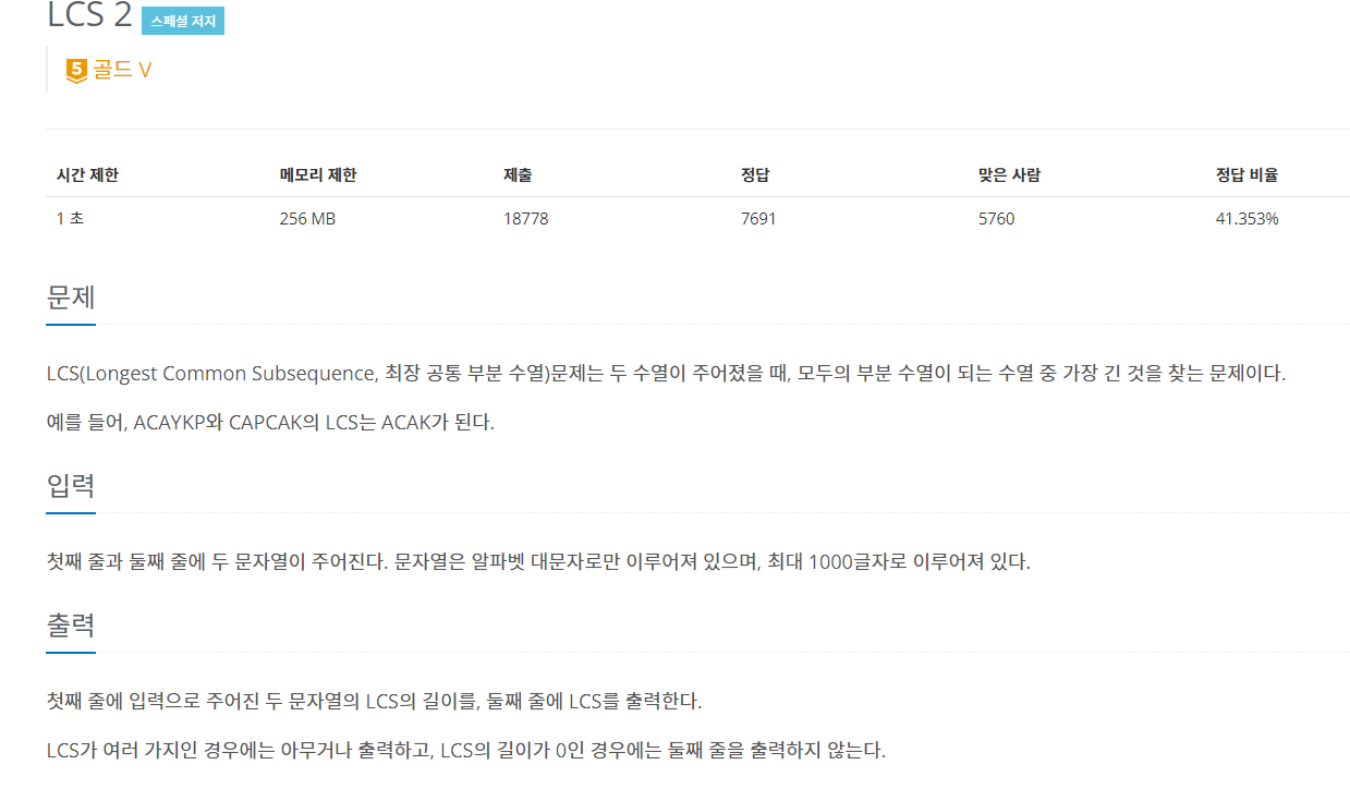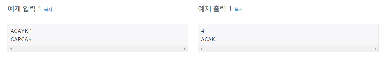 LCS(Longest Common Subsequence, 최장 공통 부분 수열)문제는 두 수열이 주어졌을 때, 모두의 부분 수열이 되는 수열 중 가장 긴 것을 찾는 문제이다. 예를 들어, ACAYKP와 CAPCAK의 LCS는 ACAK가 된다.