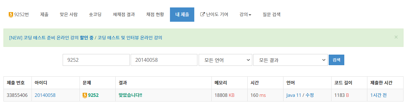 그럼 다시 탐색하지않게 하기위해 기존의 결과를 메모이제이션으로 기록해뒀다가 써야하므로 DP로 접근.