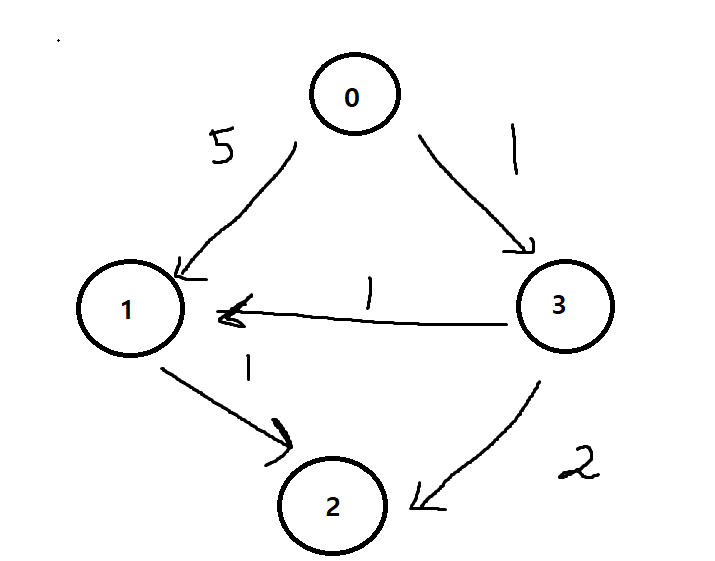 최단 경로가 될 수 있는 경우의 수는 2가지이다. (0->3->2 , 0->3->1->2)