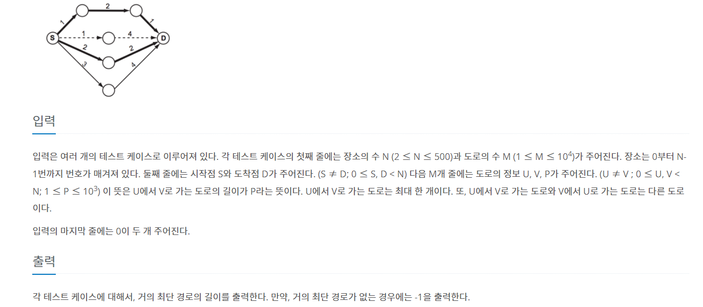 쉽게 풀 수 있을줄 알았다 .. 최단 경로 찾아서 없애주고 , 처음 구한 최단경로보다 높은 값 나올때까지