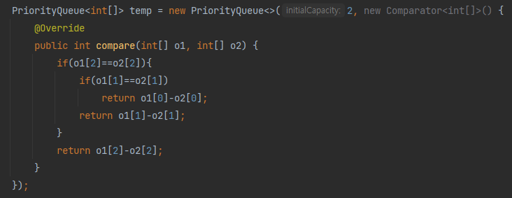 PriorityQueue<int[]> temp = new PriorityQueue<>(2, new Comparator<int[]>() {
