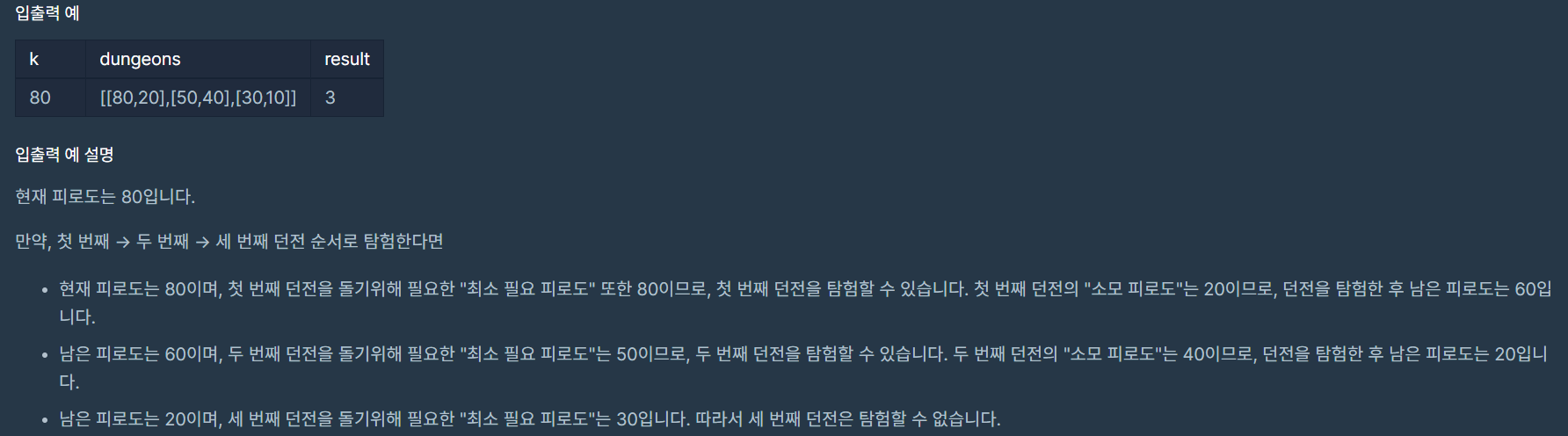 XX게임에는 피로도 시스템(0 이상의 정수로 표현합니다)이 있으며, 일정 피로도를 사용해서 던전을 탐험할 수 있습니다. 이때, 각 던전마다 탐험을 시작하기 위해 필요한 "최소 필요 피로도"와 던