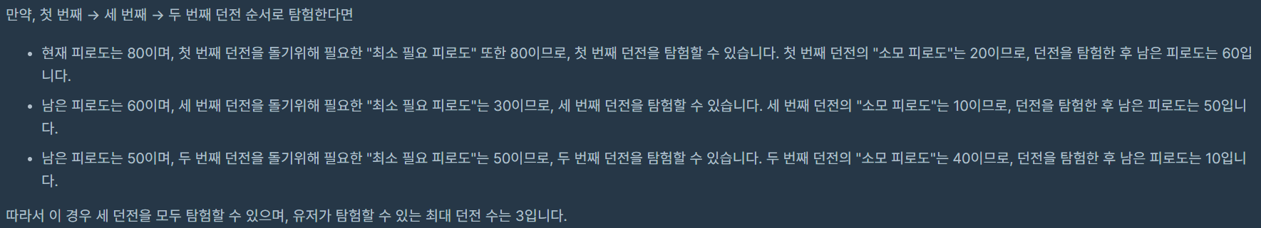 던전의 방문여부를 visit , 던전을 통과한 시점으로 남은 피로도를 tired , 던전 진행 갯수를 depth라고 하면