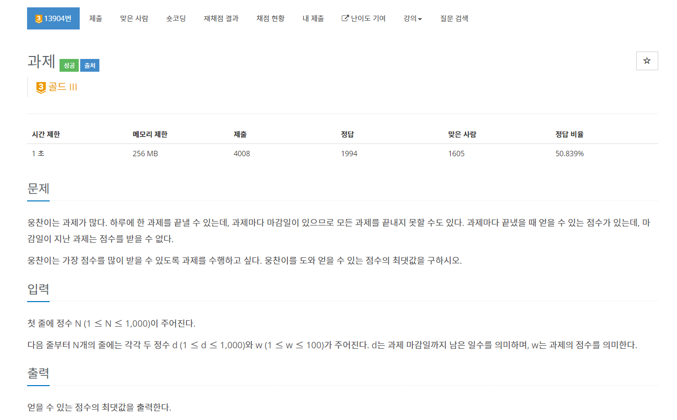 https://www.acmicpc.net/problem/13904