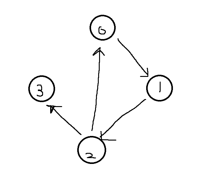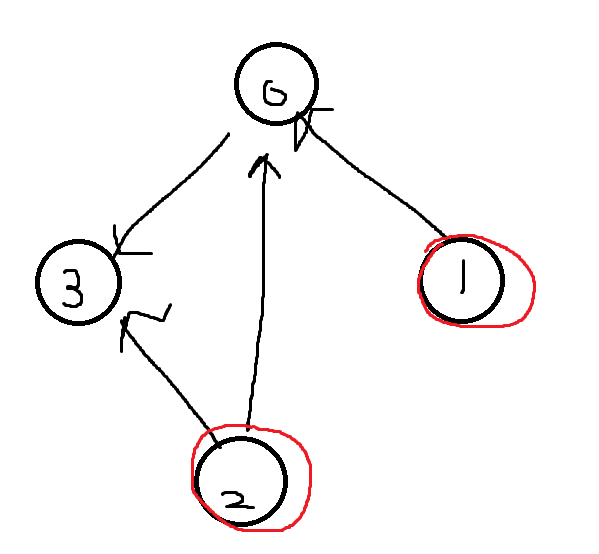 하지만 반례도 있다.두 번째 입력 예제에선 1번과 2번노드 둘다 indegree=0 이 되기 때문에 서로 간에 이동이 불가능하다.