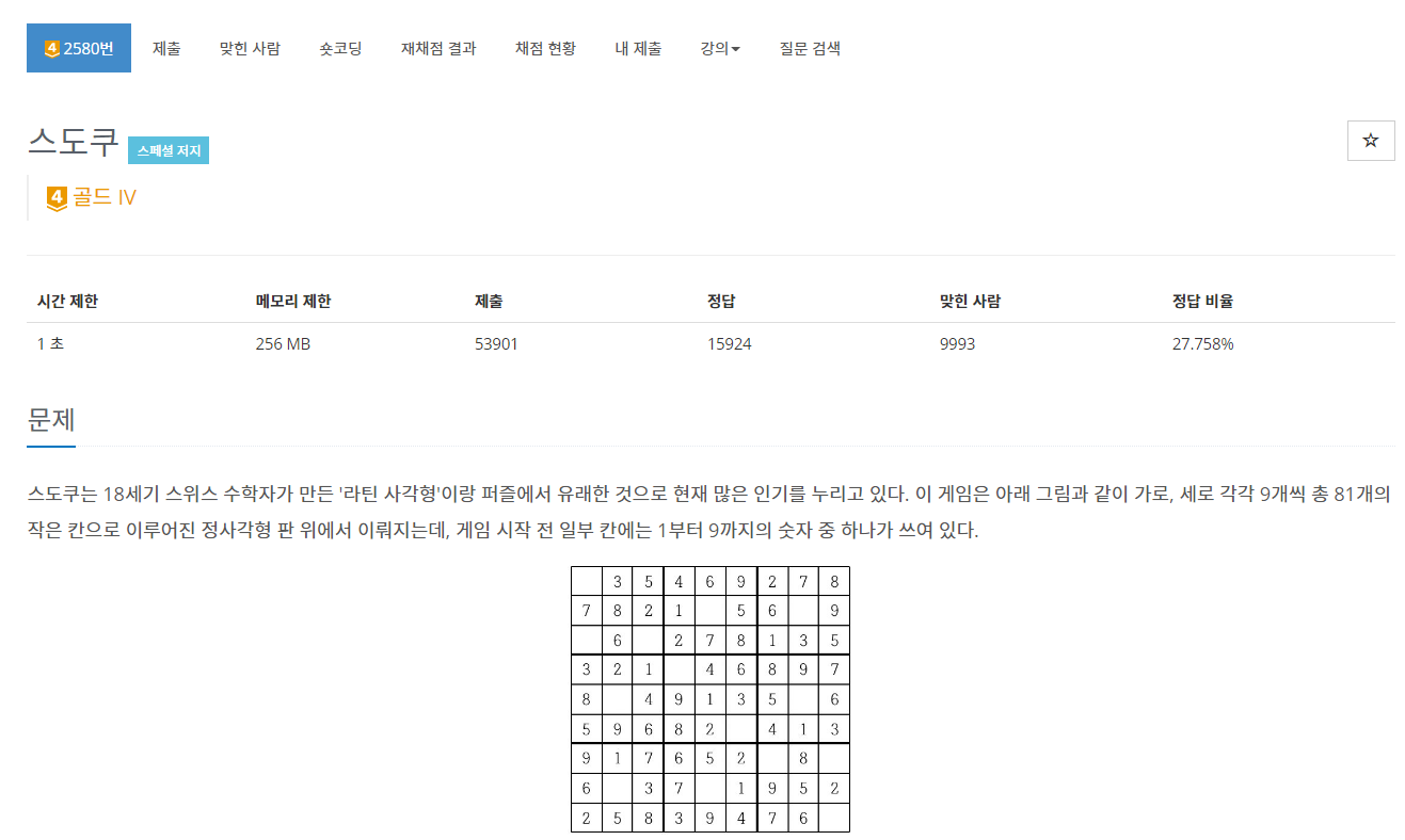 스도쿠 요약 : 가로줄, 세로줄, 부분 정사각형 모두 1~9까지 숫자가 한번씩만 있어야 함.